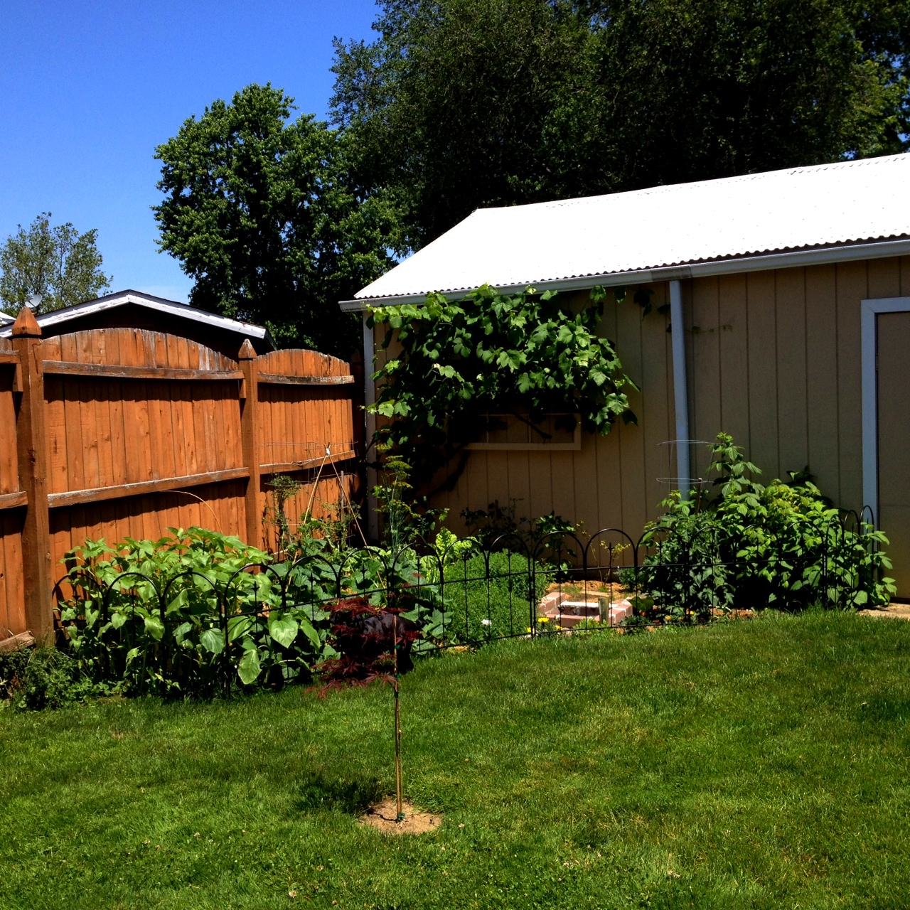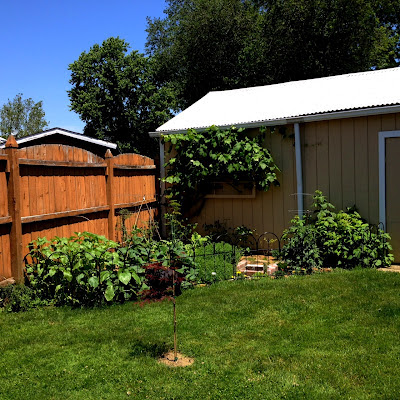 To the left is sunflowers, soon-to-be 15' tall with some shorter ones mixed in to cover the taller stems and look full. Behind that is my cucumber teepee. It's shorter, but I chose bushing pickle-sized because I'm planning to learn how to make my own pickles. My brother gave me a copy of Liana Krissoff's CANNING for a New Generation and there are so many pickle recipes to try out. I'm probably leaning towards her Quicker Kosher Dills recipe for my first try.