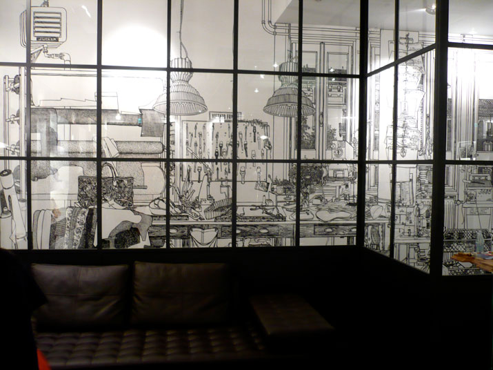 Charlotte is a British artist known for her wall drawings and drawn room installations. These densely detailed 1:1 scale drawings of rooms in rooms are invariably made with thick black marker pen on a white ground. The images above are from work she did in Milan, Italy at the Fontana shop. Her perspective is amazing.