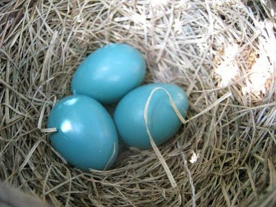 This is the second year my birds have come back to the same nest! I took photos of them last year and peeked last week but the nest was empty. Two days ago, I saw a bird hanging out near the same tree. I looked today and there are three pretty eggs in there!