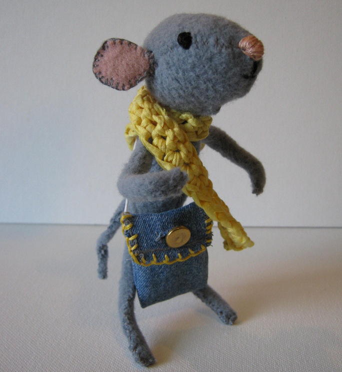 Meet Timony! He's a sweet mouse whose favorite color is yellow. He comes with his own mini denim messenger bag and scarf. The scarf does fold up and fit into the bag for easy traveling and his bag has a vintage brass button. He prefers his scarf on so he has space in his bag to collect lentils.